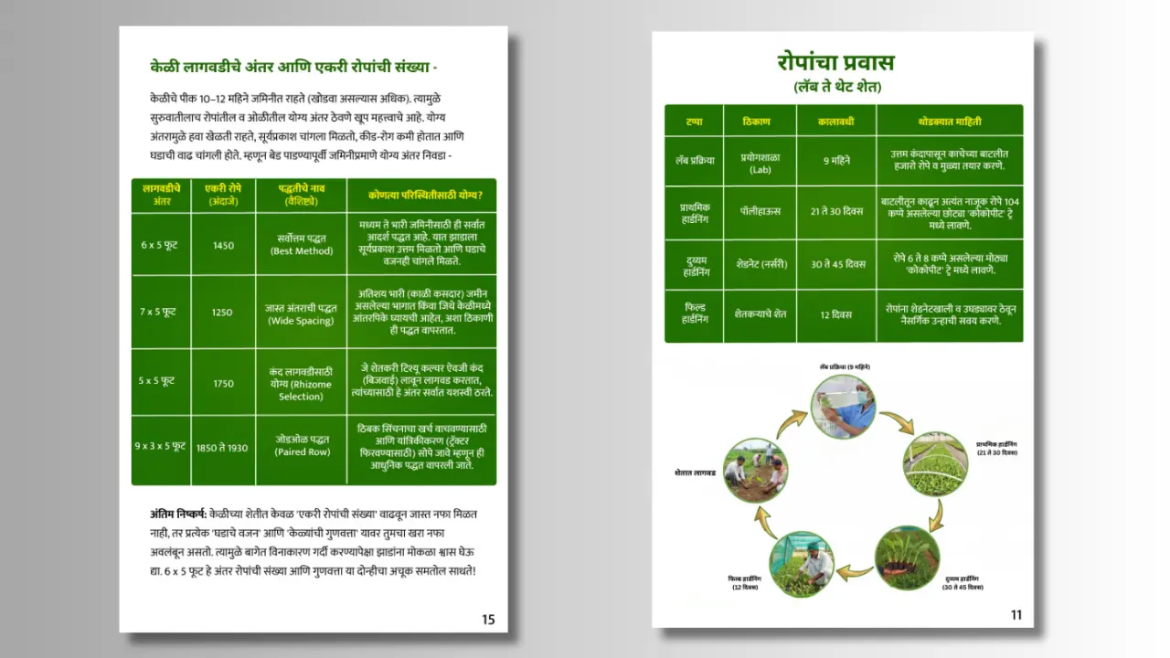 - ✔ रोग व कीड नियंत्रण: करपा (Sigatoka), CMV आणि Rhizome Rot रोगावर प्रभावी फवारणी वेळापत्रक.