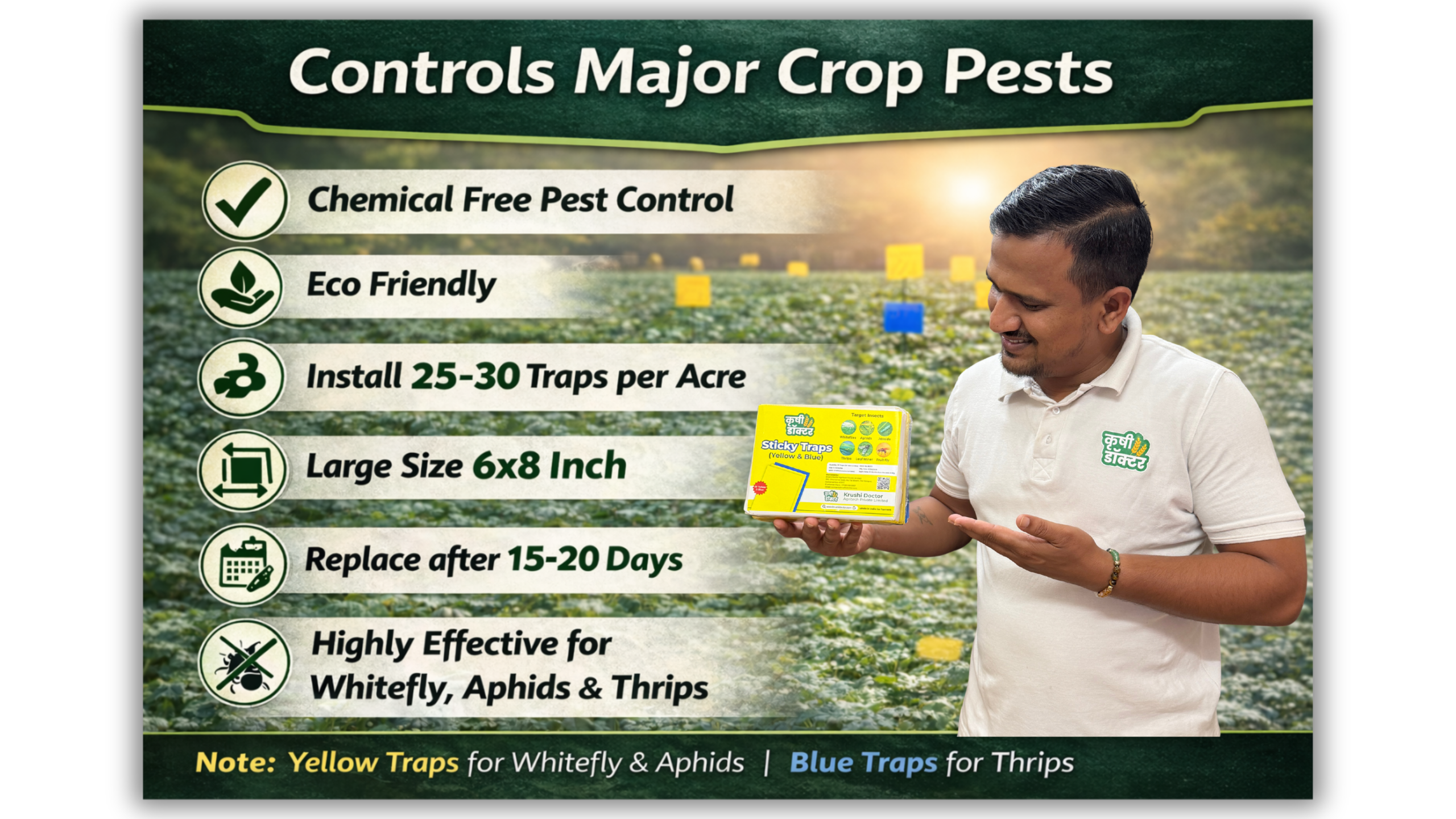 शेतातील पांढरी माशी (Whitefly), थ्रिप्स (Thrips), मावा (Aphids) आणि इतर उडणाऱ्या किडींचे प्रभावी नियंत्रण करण्यासाठी हा Yellow + Blue Sticky Traps अत्यंत उपयुक्त आहे.